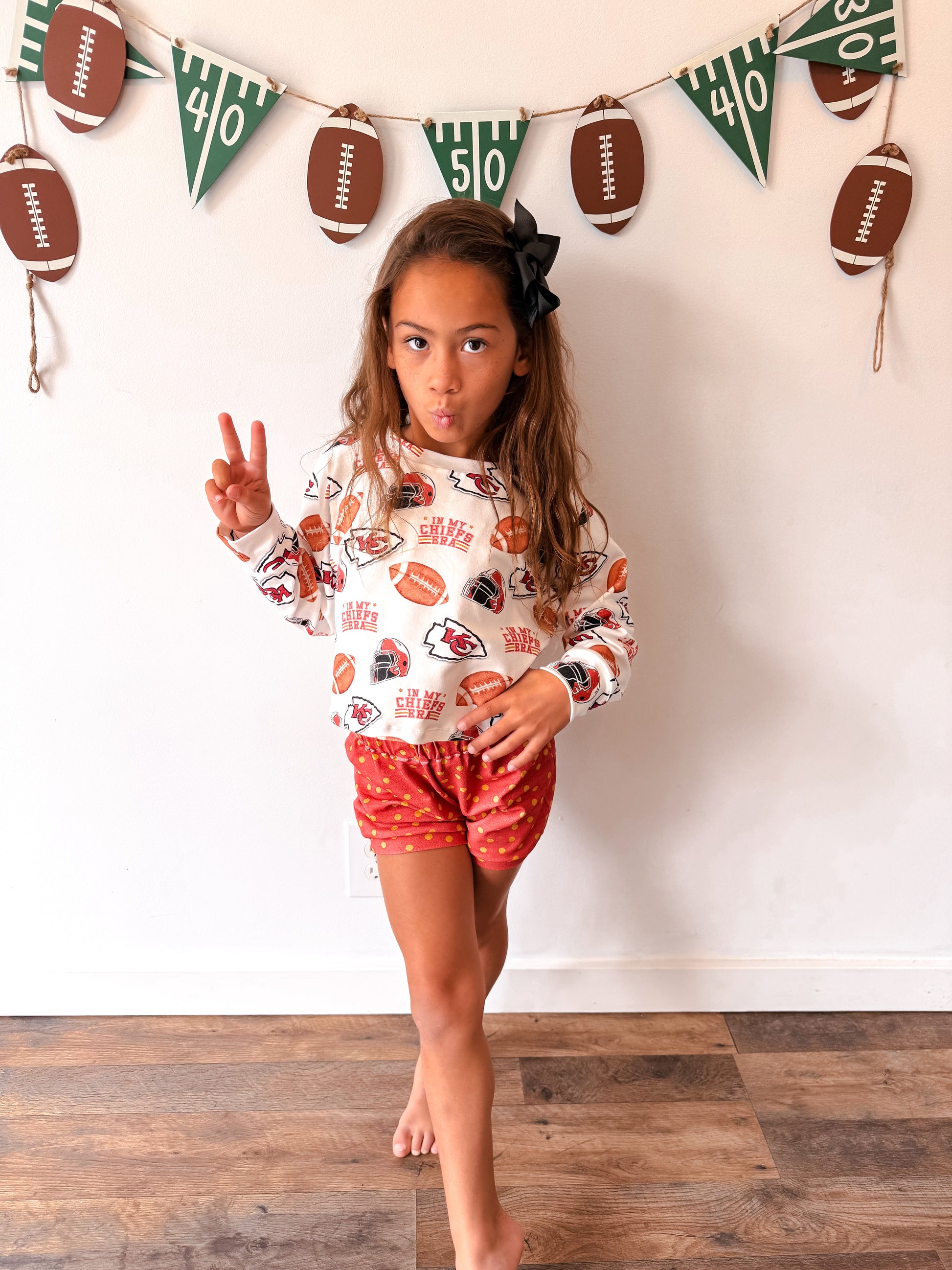 This Girl’s Chiefs Era Shorts Outfit combines sporty comfort with vibrant team spirit, perfect for fall. Designed for active girls, the set features breathable shorts and a coordinating top with authentic Chiefs colors and details, ensuring ease of movement and seasonal suitability. Ideal for football fans eager to show support while enjoying outdoor play during cooler months.